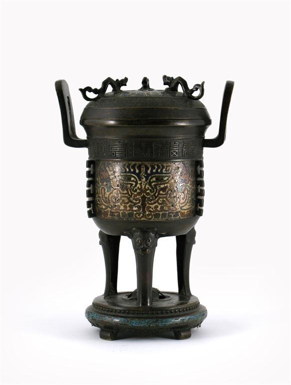 A large Chinese bronze and champlevé ding 19th century, the cover with three kylin, the body cast with a band of characters and with stylized taotie designs, all on tall slender legs and a circular base, 45cm. (2)