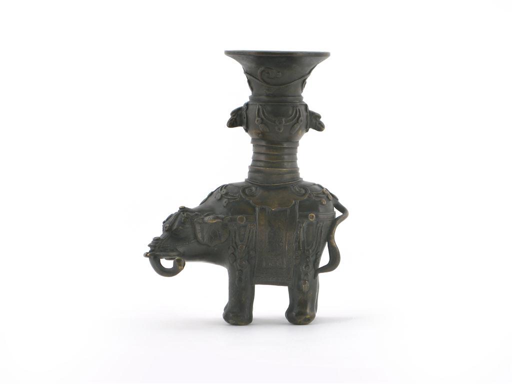 A Chinese bronze vase 18th / 19th century, mounted on the back of an elephant with its head turned slightly to the left, minor damages, 17.8cm.