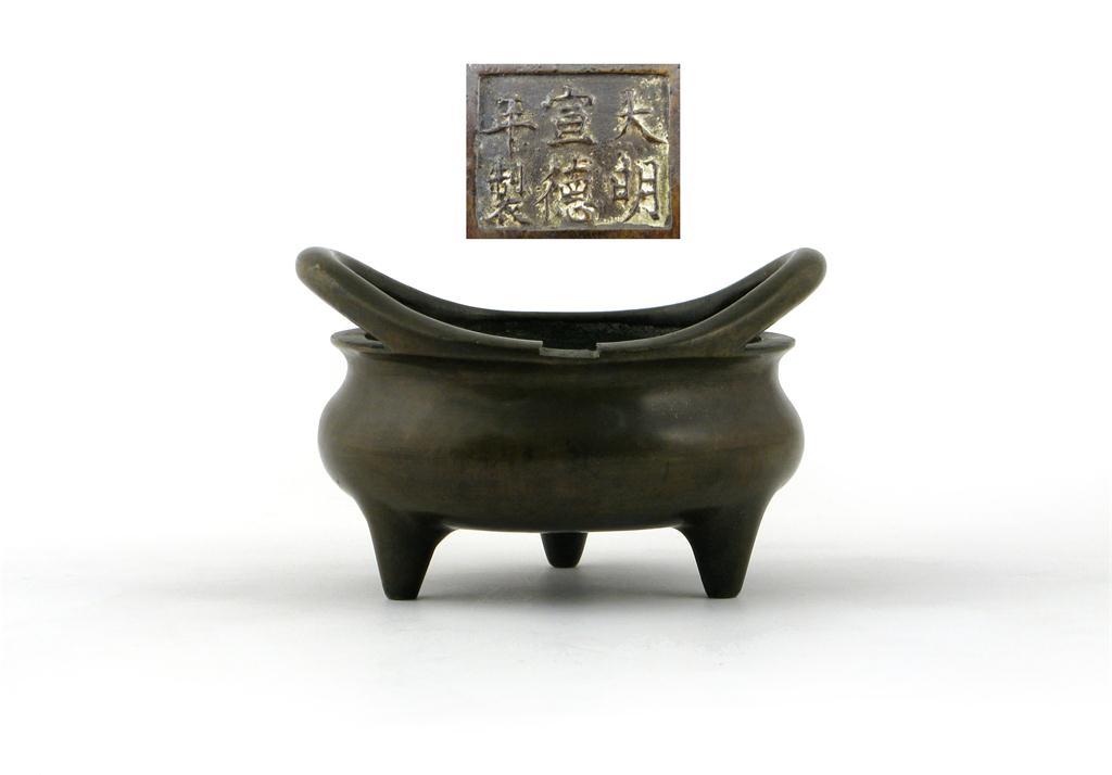 A Chinese bronze tripod censer probably 17th century, with curved handles and a notch to the rim, the base with a six character Xuande mark, 16cm.