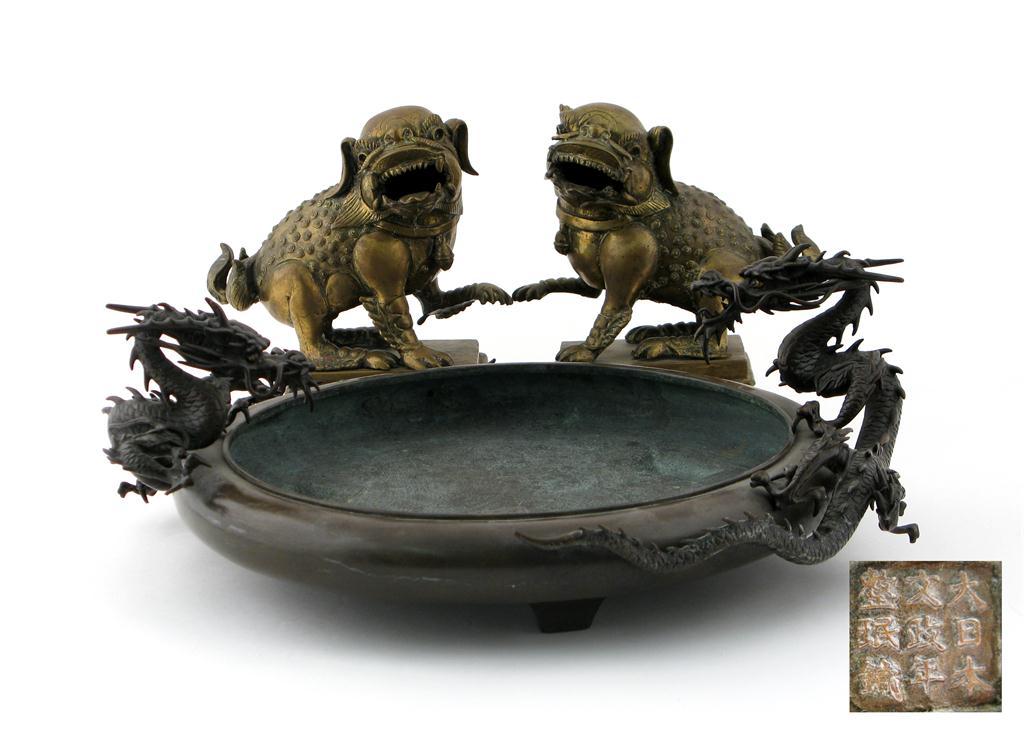 A Japanese bronze shallow bowl c.1900, with dragons applied to the rim and a nine character mark to the base, and a pair of bronze lion dogs, 43cm max. (3)