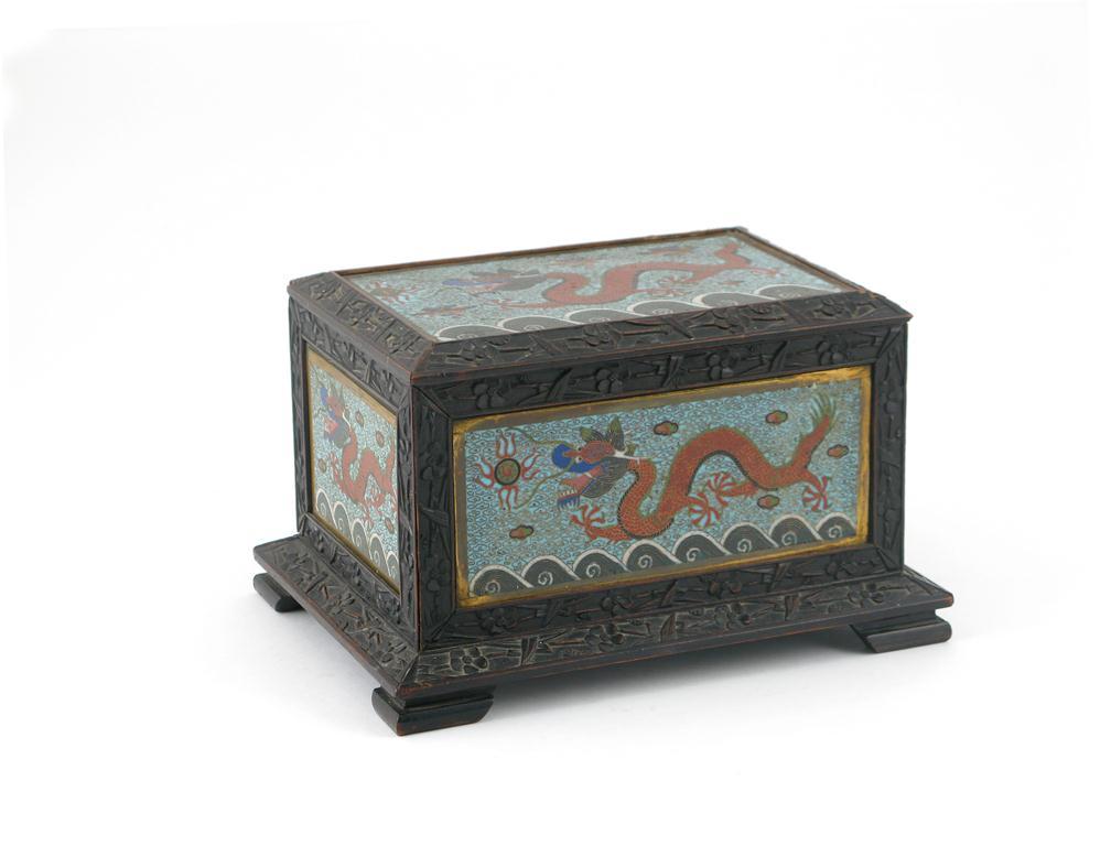 A Chinese cloisonné and carved wood casket c.1900, decorated with panels of dragons framed by borders carved of prunus, damages, 24.5cm.
