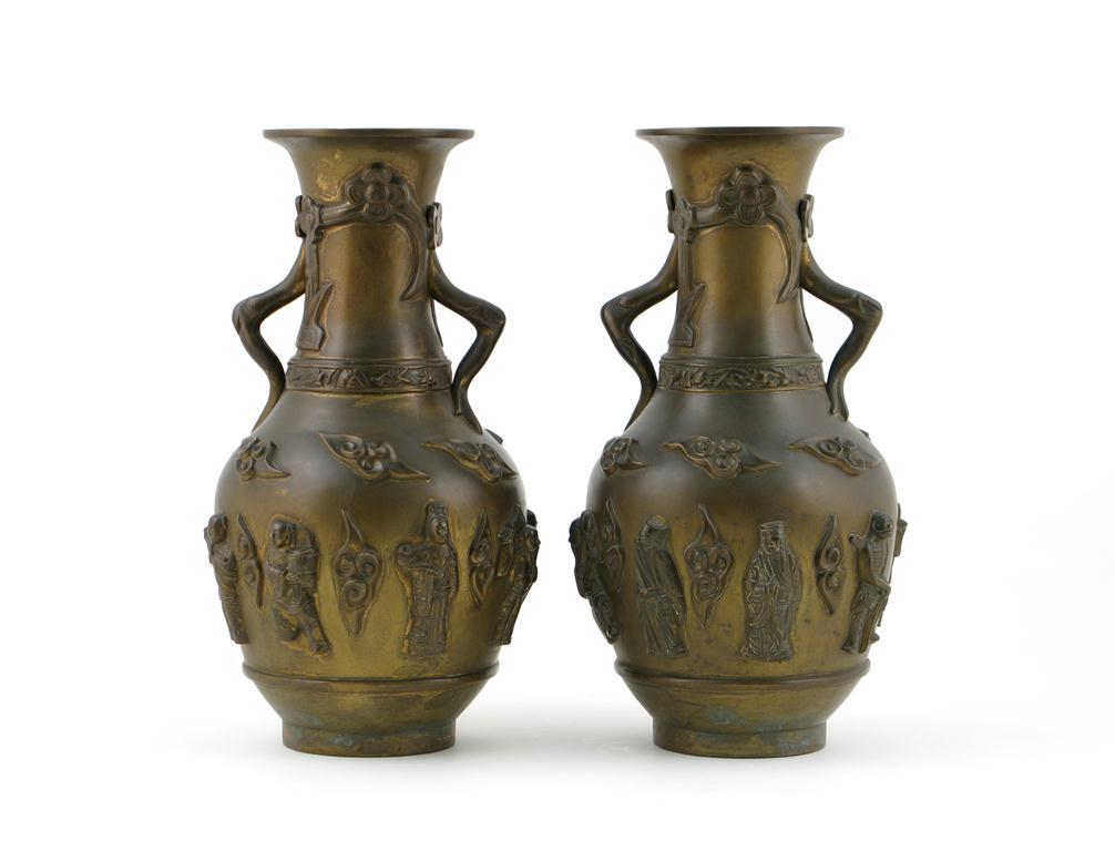 A pair of Chinese moulded brass vases 19th / 20th century, cast in high relief with figures, cloud scrolls and prunus, each with a six character Xuande mark, 39.5cm. (2)