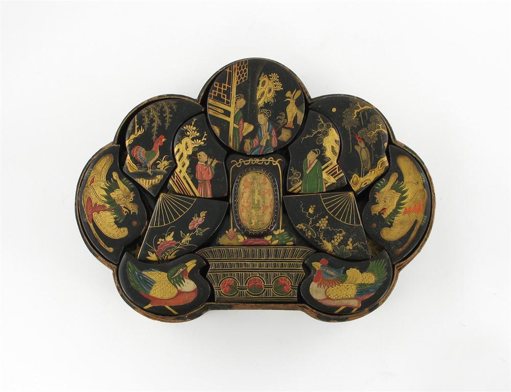 A black lacquer shaped box and cover 19th / early 20th century, containing an arrangement of smaller shaped boxes, painted in gilt and polychrome with birds, figures, mythical beasts and pagoda scenes, damages and wear, 43cm.