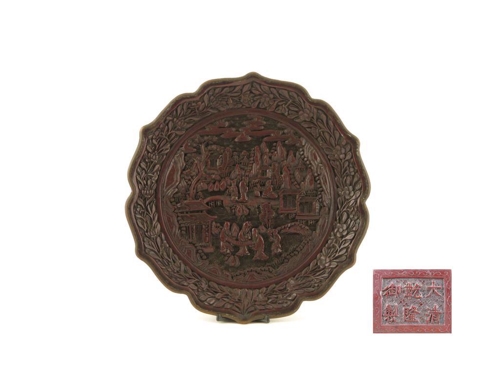A Chinese lacquer dish six character Qianlong mark but later, carved in high relief with figures viewing a scroll in a pagoda landscape, 23cm.