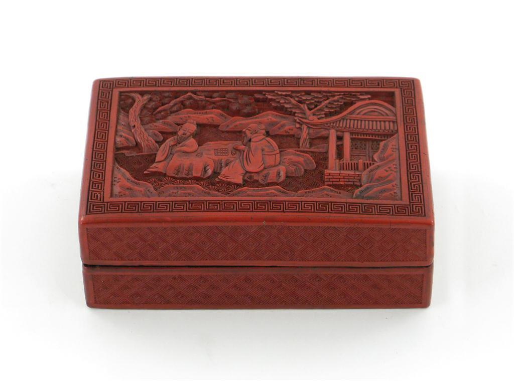 A Chinese red lacquer rectangular box and cover 19th / 20th century, decorated with two figures playing go in a garden, 17.5cm. (2)
