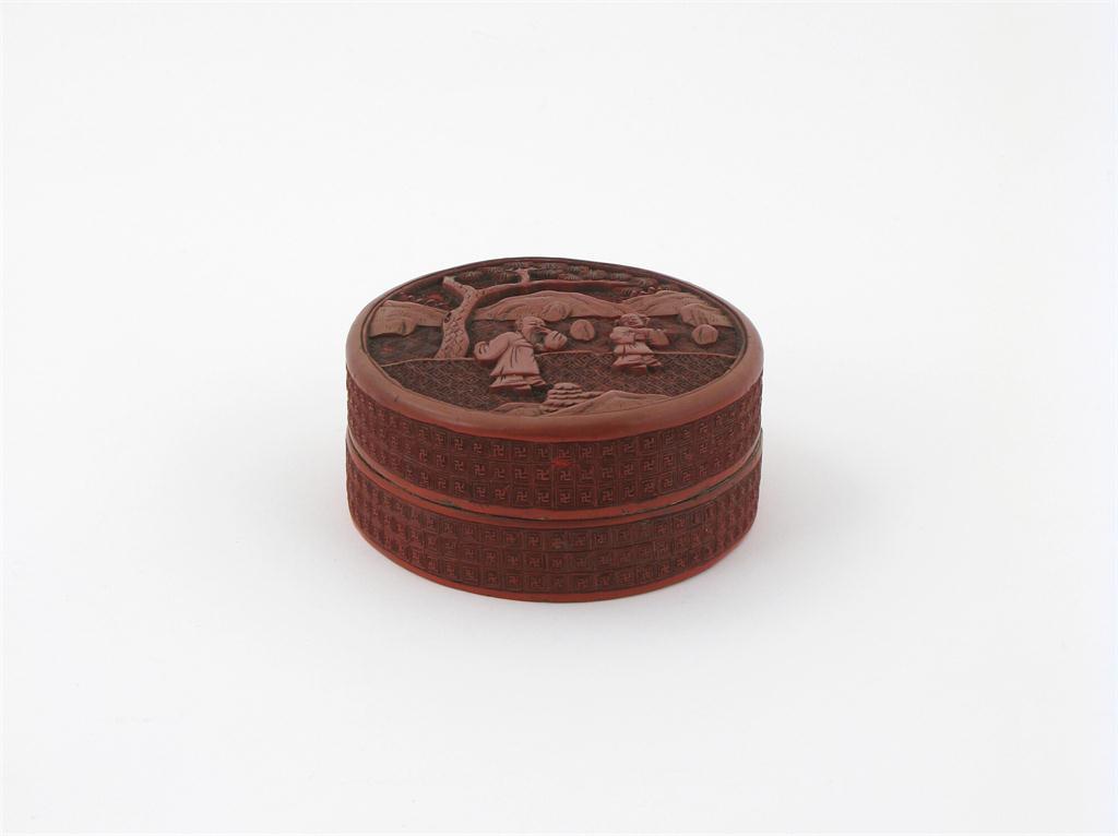 A Chinese red cinnabar lacquer box 19th century, the lid decorated with two figures in a mountainous landscape beneath a tree, the sides with swastika diaper, some damages to the flange and the rims, 9.5cm. (2)