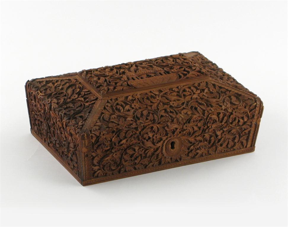 A Middle Eastern sandalwood rectangular box 19th century, the hinged lid with chamfered panels and decorated with elaborate carved scroll work incorporating a domed building, birds, flowers and foliage, old wear, chips and small repairs, 25cm.