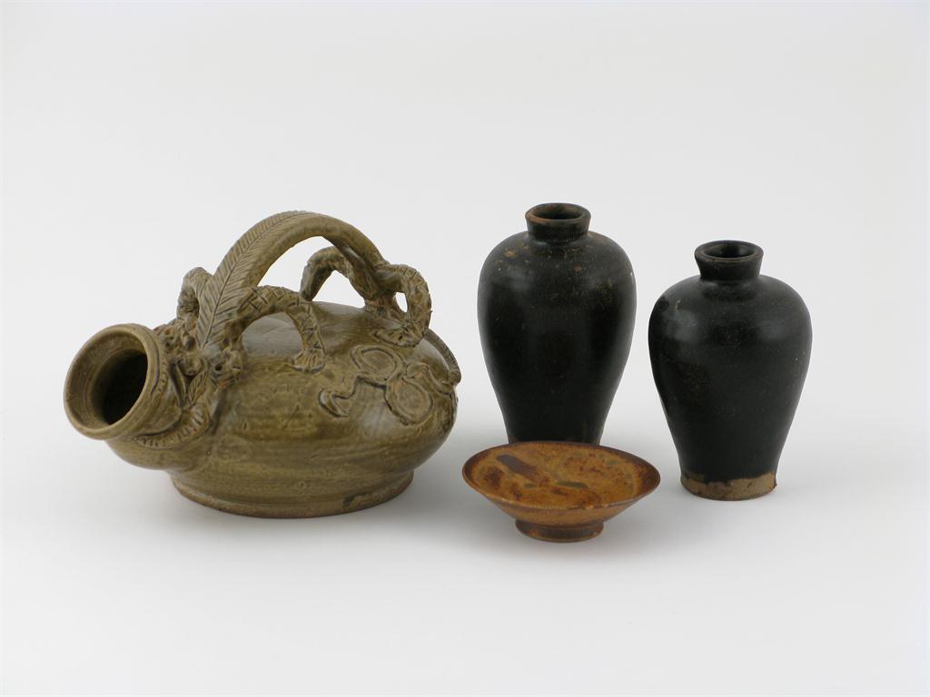 Four Chinese stoneware items comprising: a small pair of black glazed vases, a yue yao glazed flask with an animal handle and a small yue yao dish, 21cm. (4)