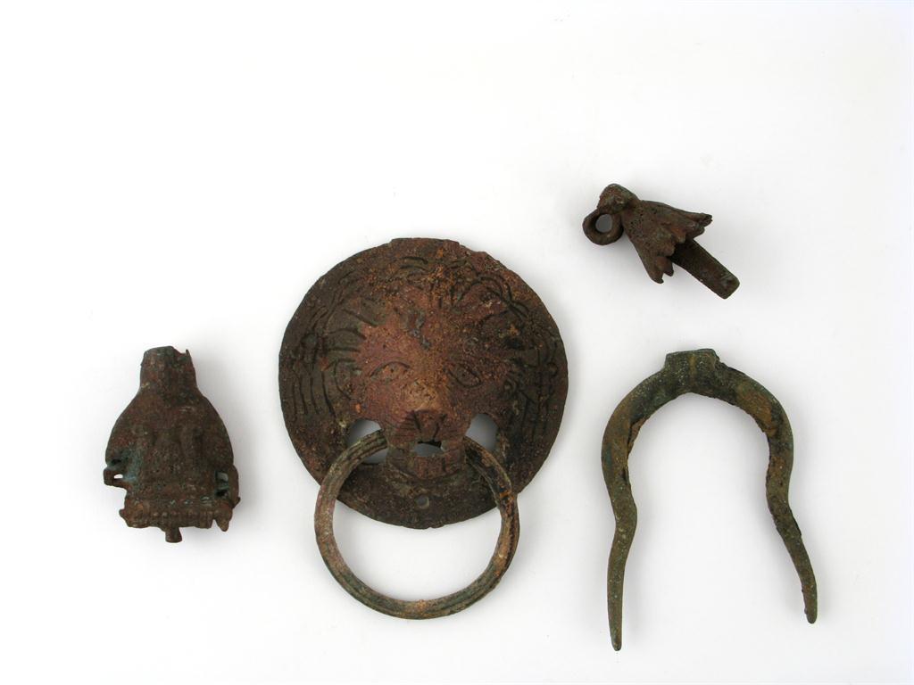 A Roman bronze lion mask handle 2nd century AD, and three miscellaneous bronzes, c.600 BC, comprising a pair of horns, a lotus flower amulet and a sistrum fragment cast with two heads of Hathor, 16cm. (4)