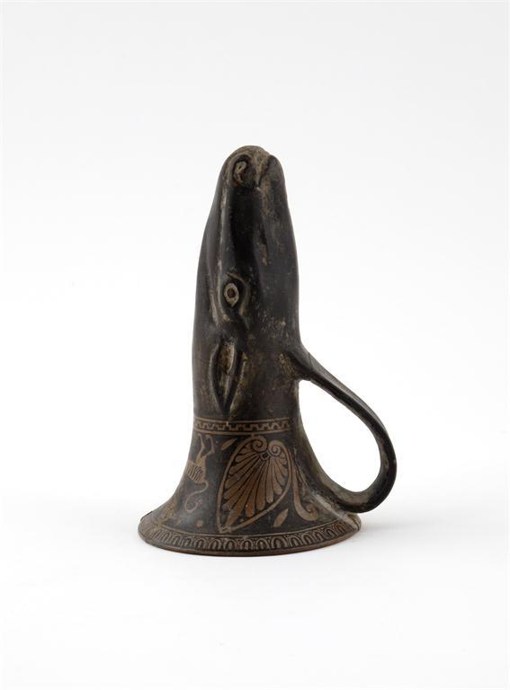 A pottery red figure rhyton probably c.2nd century, decorated with Hercules and Cerberus between anthemion designs, damages, 15.5cm.