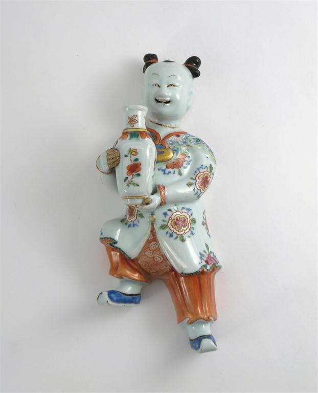 A Chinese famille rose wall vase 18th century, modelled as a boy wearing a floral jacket and holding a vase, damaged, 22.2cm.