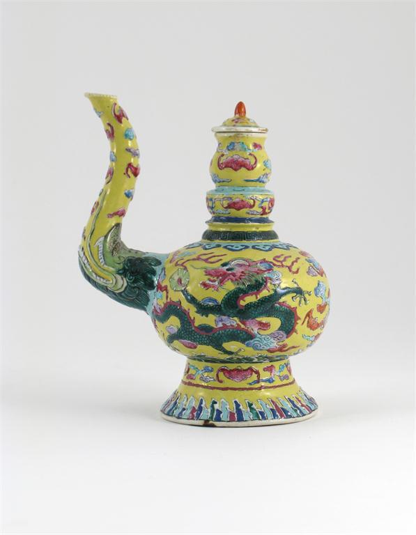 A Chinese yellow ground Tibetan-style ewer and cover 19th century, moulded and decorated with dragons, bats and cloud scrolls, 19cm. (2)