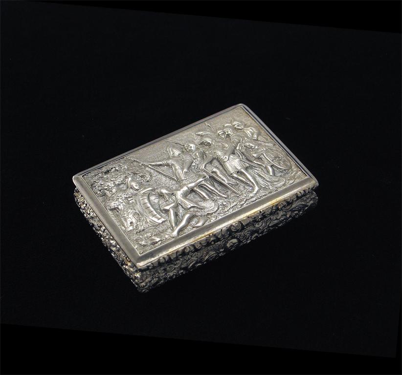 A George IV box, with embossed sides, the cover chased in relief with Diogenes outside his barrell in dialogue with Alexander the Great, gilt interior by Thomas Shaw, Birmingham 1827, 2.8in (7.2cm), 3.3oz.