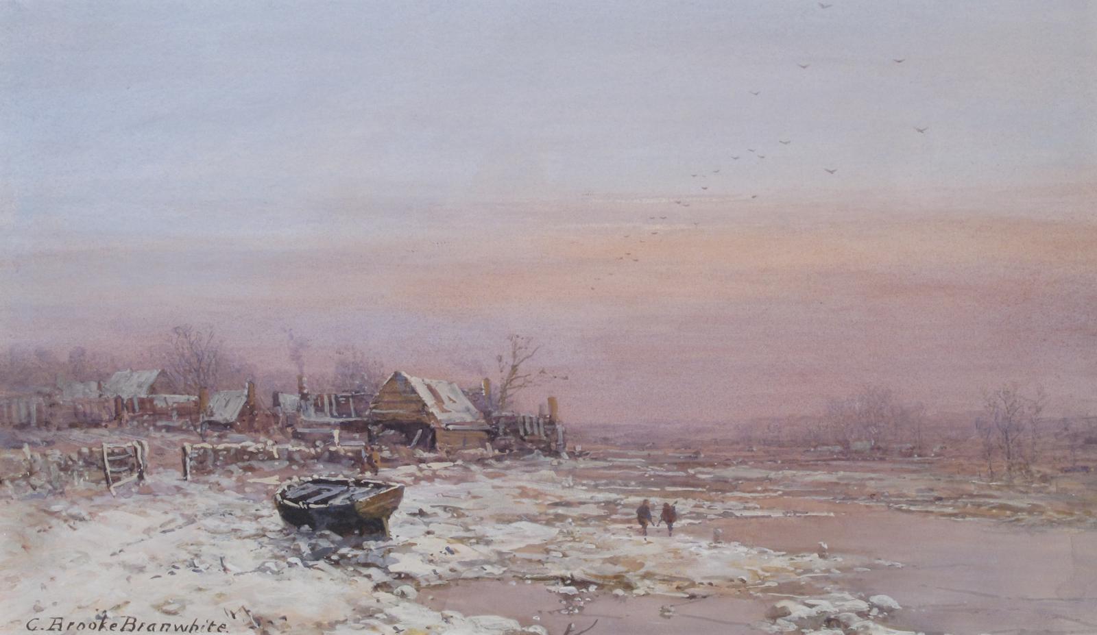 Charles Brooke Branwhite (1851-1929) Winter near Newport Signed, also signed and titled on artist's label verso Watercolour 28 x 49cm; 11 x 19¼in