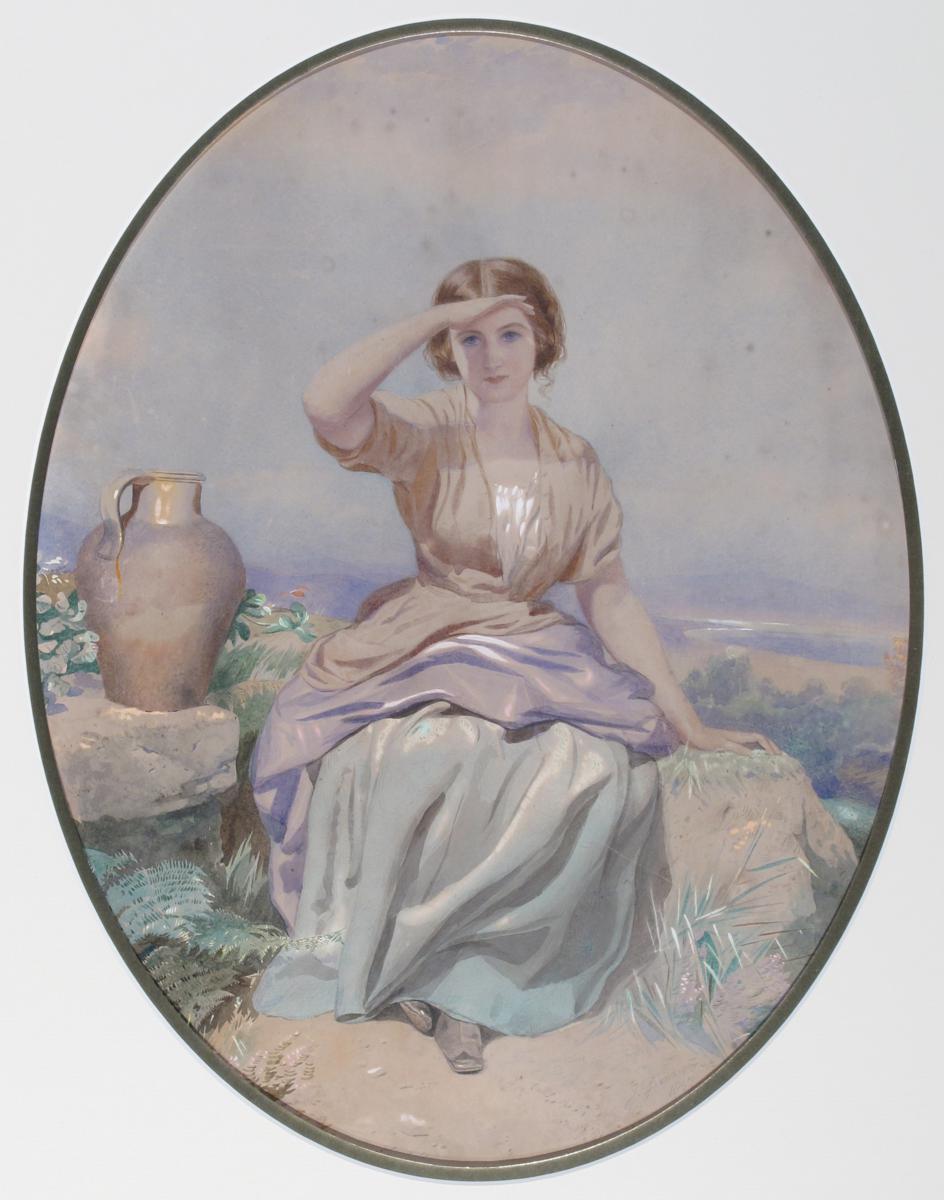 J. Simmons (19th Century) The water carrier Signed and dated 1967 Watercolour, oval 47 x 36cm; 18½ x 14in