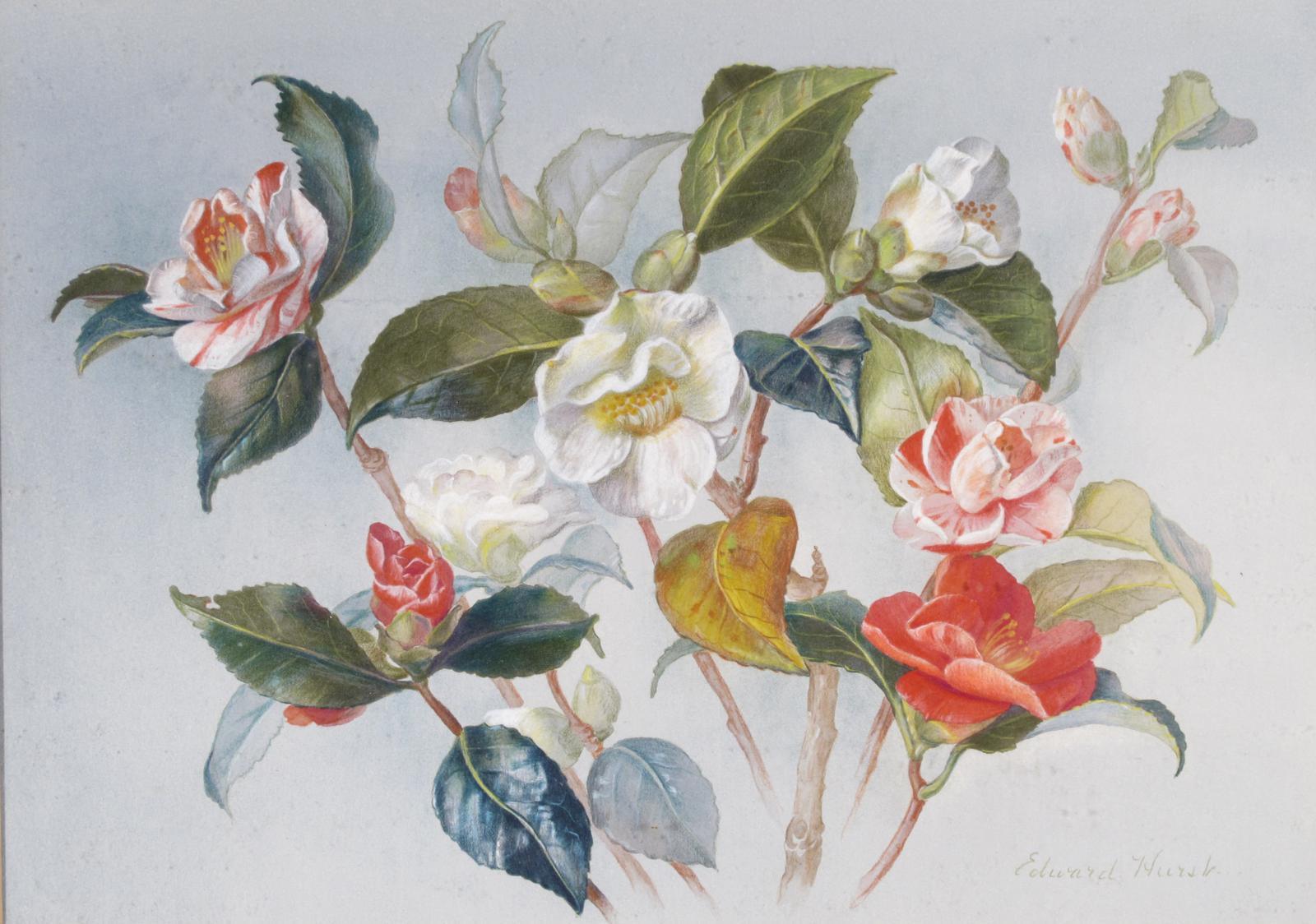 Edward Hurst (20th Century) Study of camelias Signed Watercolour with bodycolour 36 x 51cm; 14 x 20in Provenance: Tryon Gallery