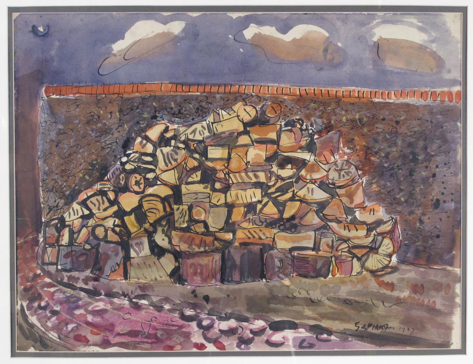 George Hooper (1910-1994) The log pile Signed and dated 1947 Pen ink and watercolour on buff...