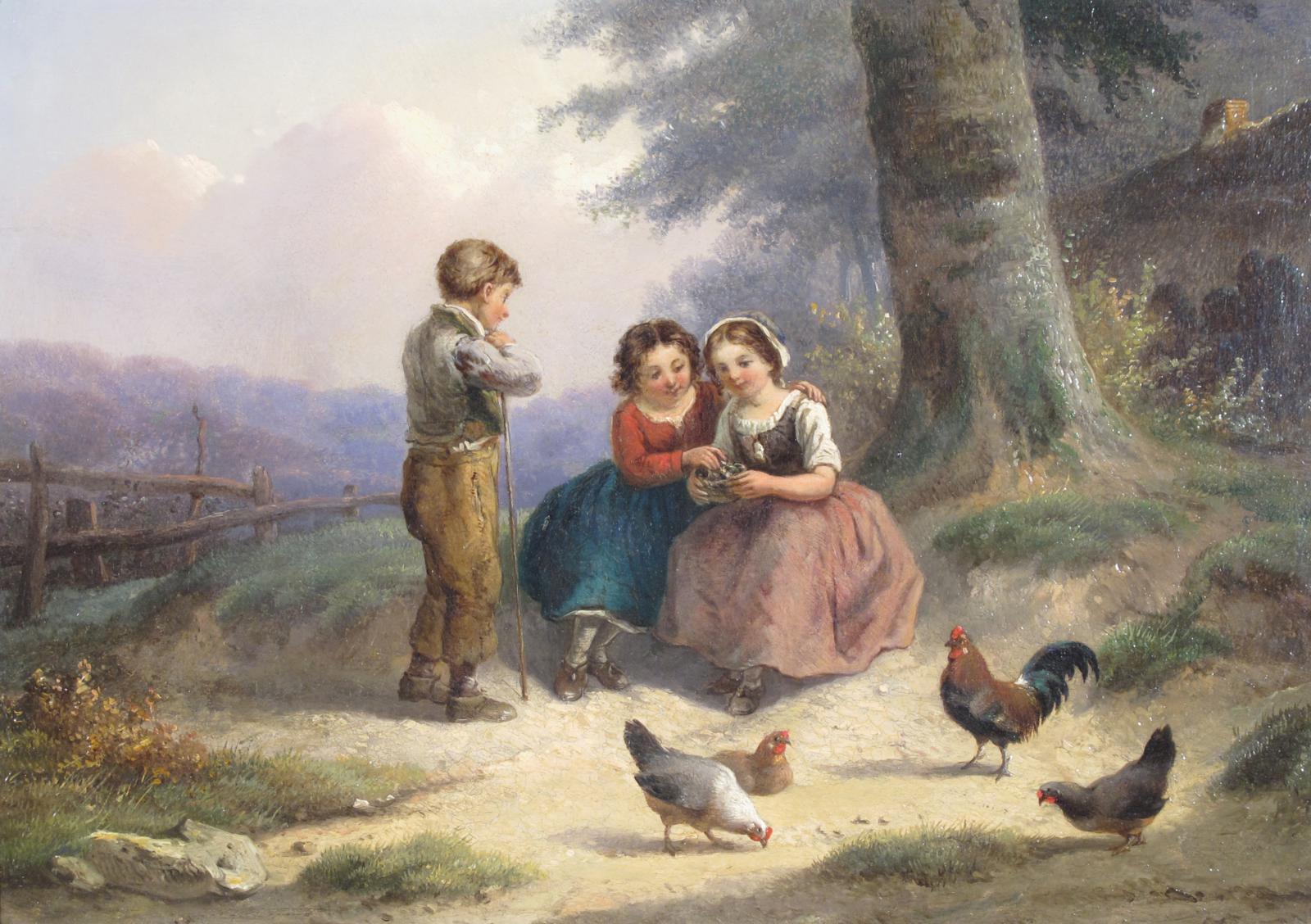 Robert Favelle (Dutch 19th Century) Children feeding the chickens Oil on panel 24 x 34.5cm; 9½ x 13½in