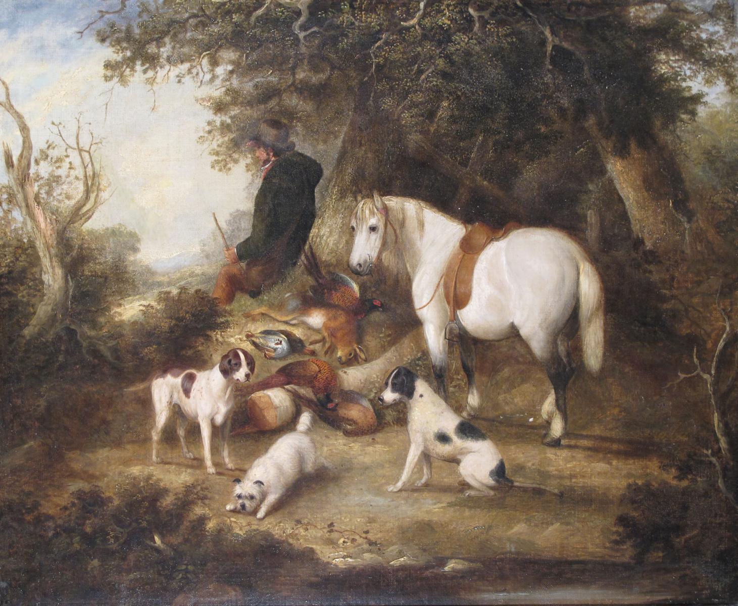 English School 19th Century A huntsman resting with his pony, hounds and the day's bag at his side Oil on canvas 51 x 61cm; 20 x 24in