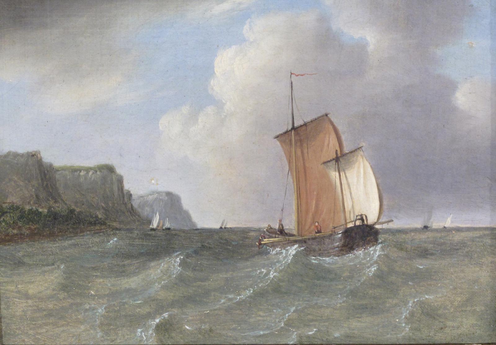 Attributed to Petrus Johannes Schotel (Dutch 1808-1865) Fishing boats off the cliffs Signed indistinctly Oil on canvas 21 x 26cm; 8¼ x 10¼in