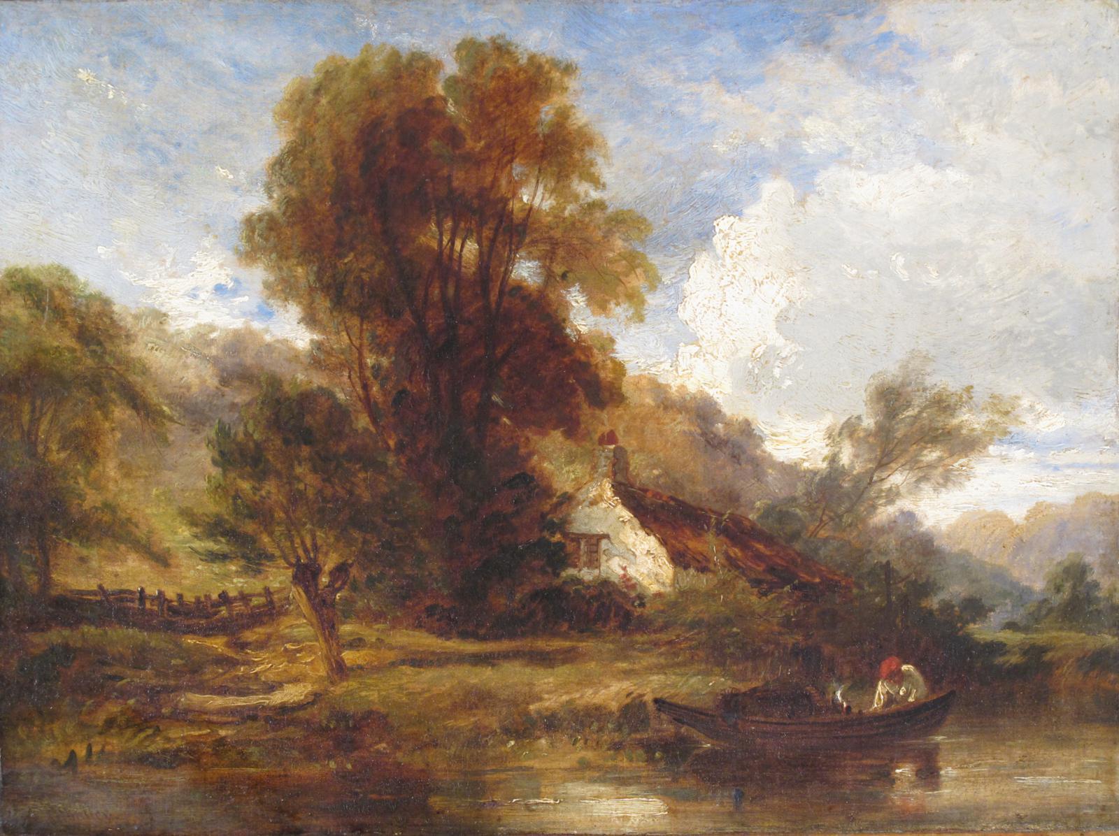William Müller (1812-1845) River landscape with a man in a boat by a cottage Signed Oil on canvas