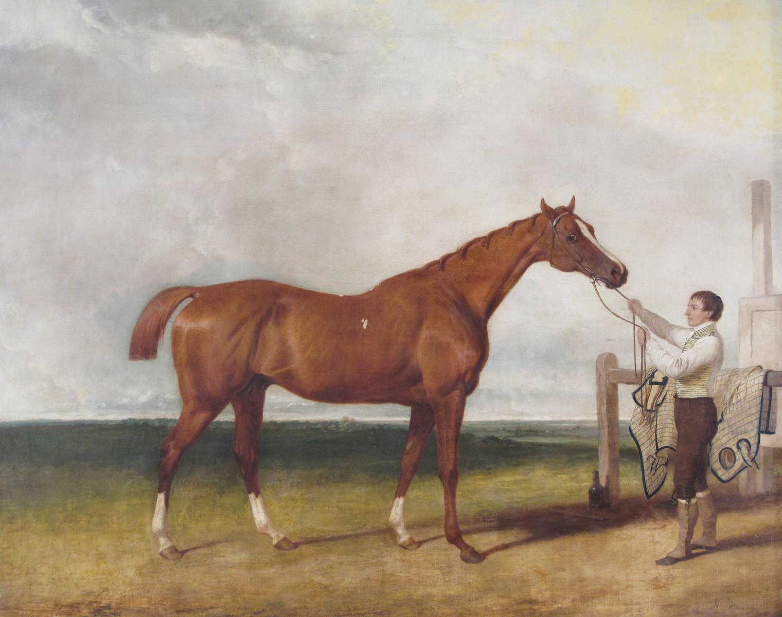 Abraham Cooper (1787-1868) A bay hunter in a park held by a groom Signed with monogram and dated 1822 Oil on canvas 64 x 79cm; 25 x 30in