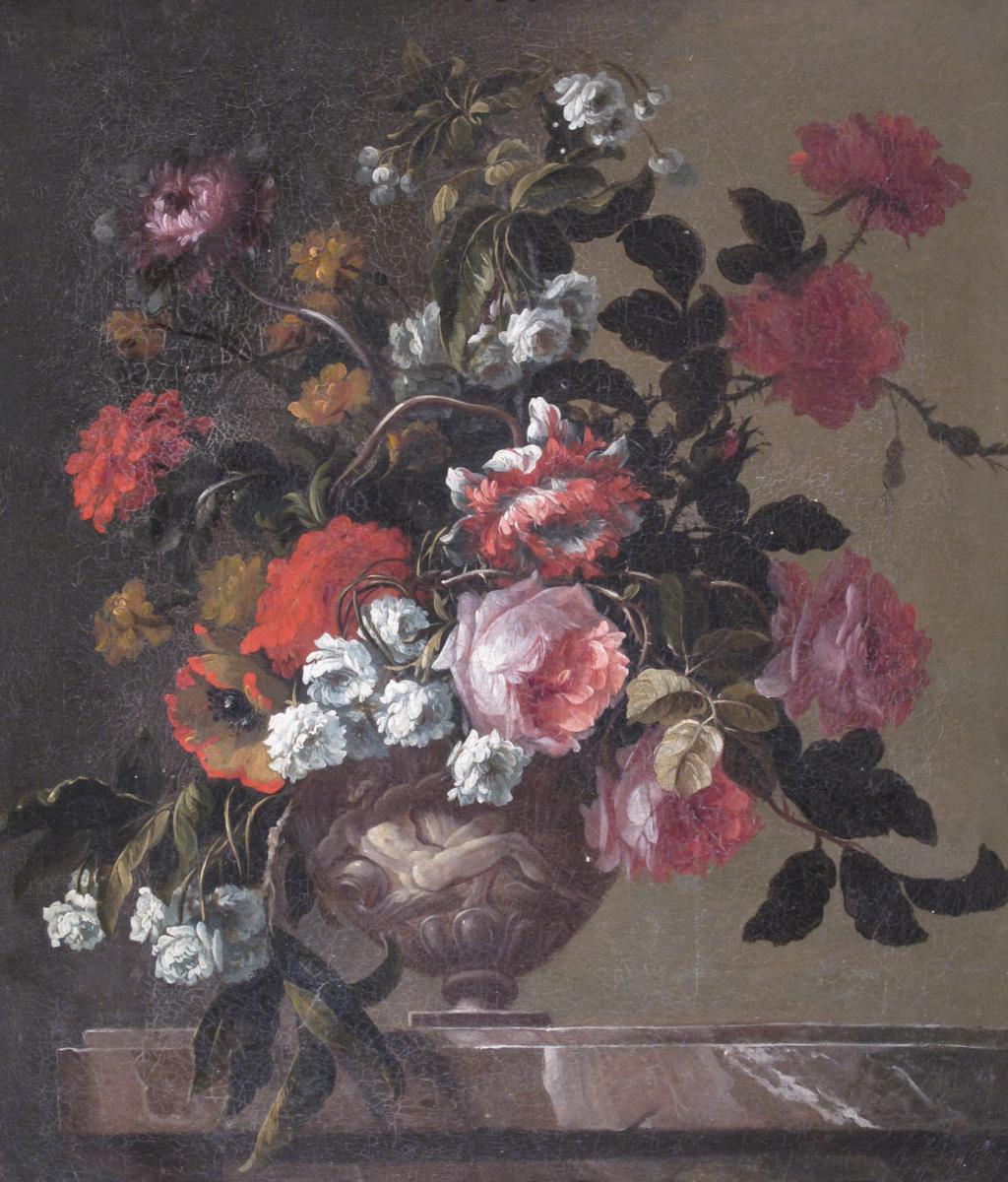 Studio of Jean-Baptiste Monnoyer Still life of flowers in an urn on a marble ledge Oil on canvas