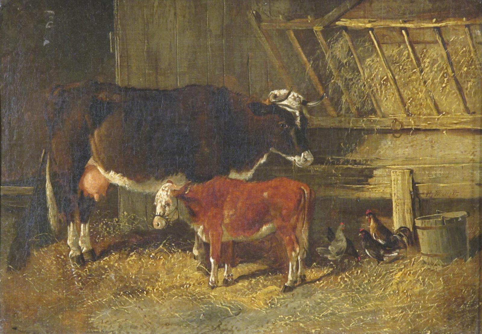 Henry A. Woollett (fl. 1851-1898) A cow and calf in a barn Signed Oil on canvas 26 x 36cm; 10¼ x 14¼in