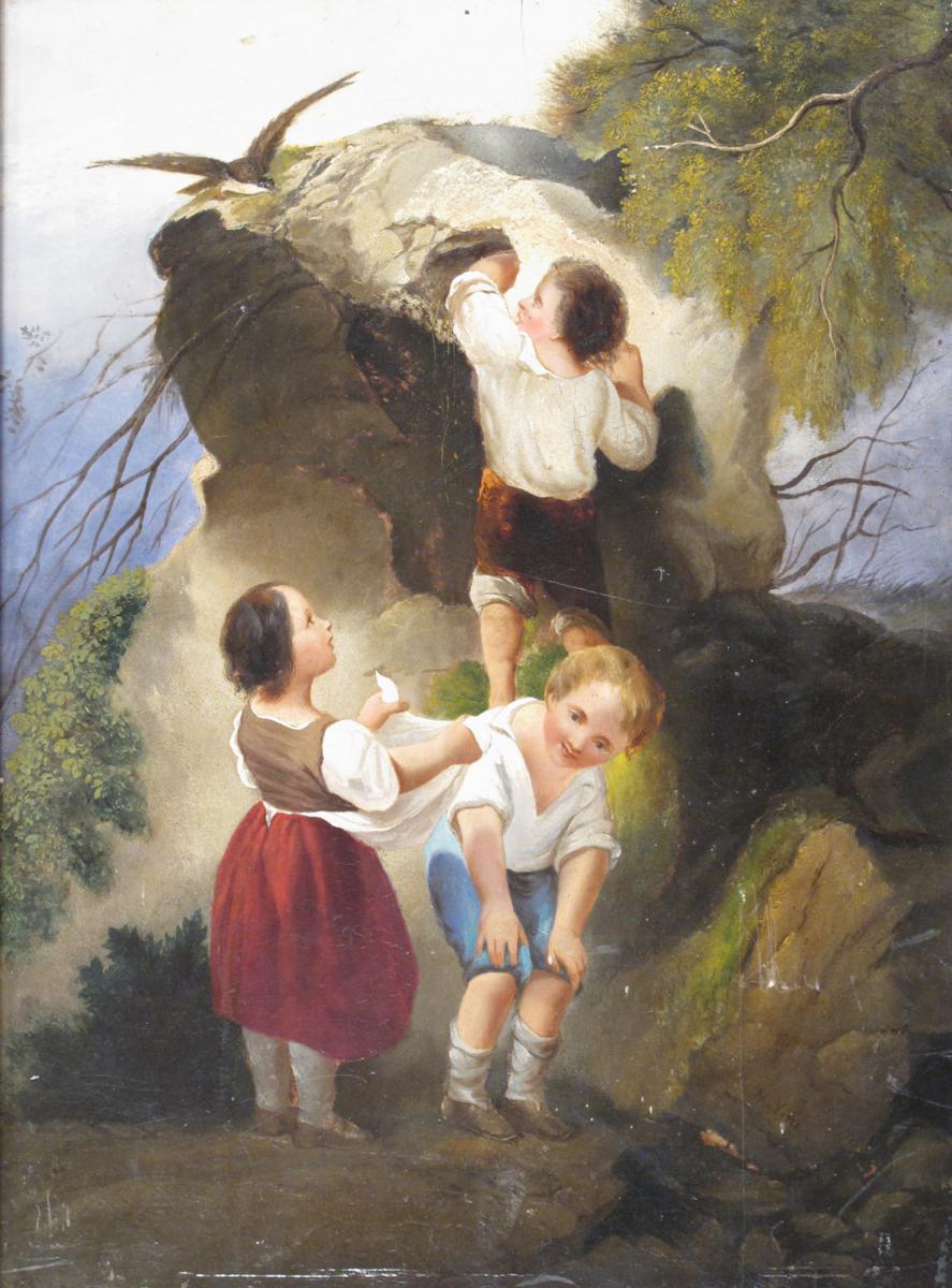English School 19th Century The young egg collectors Oil on panel, unframed 44 x 33cm; 17ΒΌ x 13in
