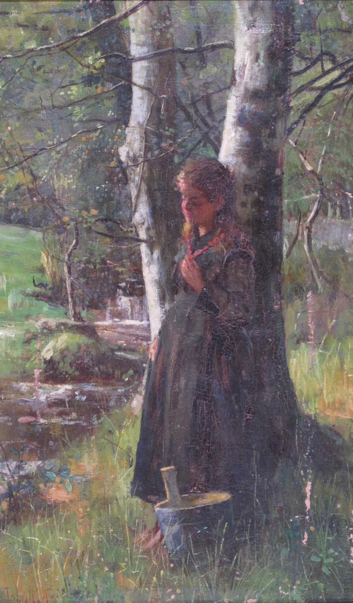 John Robertson Reid RI RBA ROI (1851-1926) A rest by the stream Signed, dated indistinctly Oil on canvas 52 x 30cm; 20½ x 12in