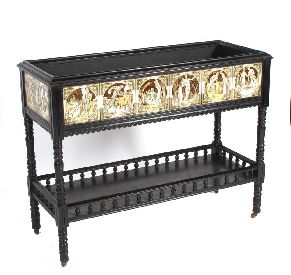 An Aesthetic Movement ebonised wood flower trough, turned wood legs with ceramic casters, the trough set to all sides with Minton Season tiles designed by John Moyr Smith unsigned 103cm. wide