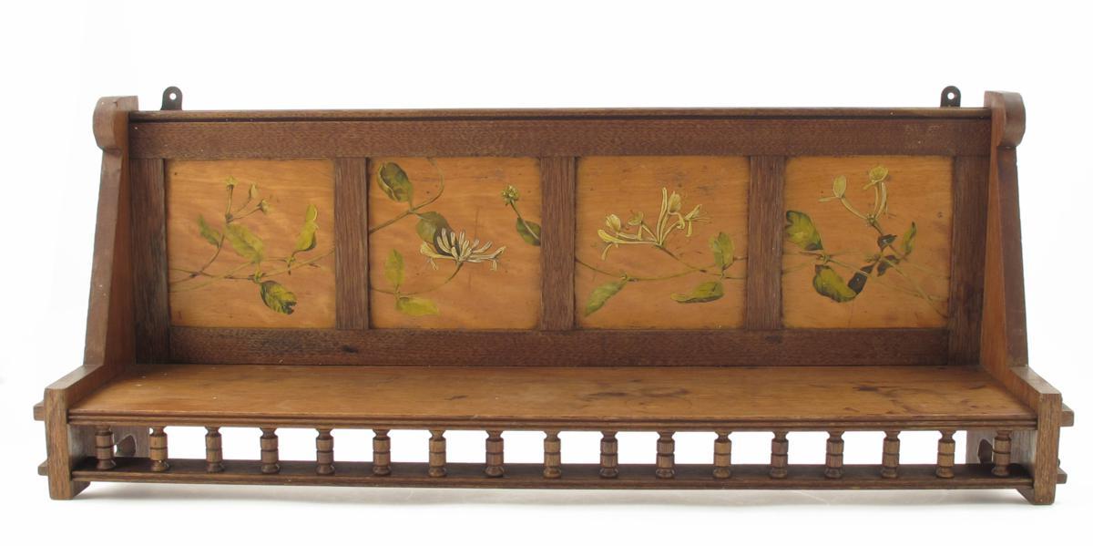 An Aesthetic Movement mahogany wall shelf, with turned bobbin base rail, the back inset with four painted honeysuckle and mistletoe panels unsigned 71cm. wide