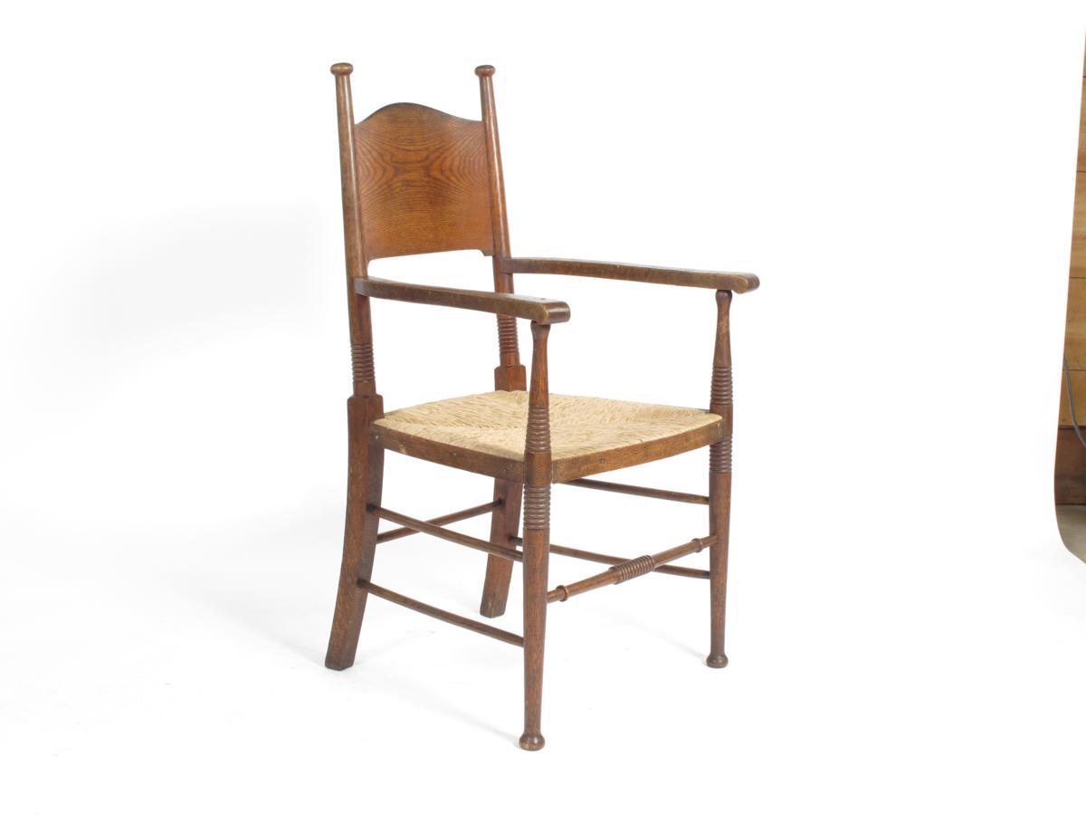 A William Birch oak carver chair, with turned legs and rush seat unsigned 105cm. high