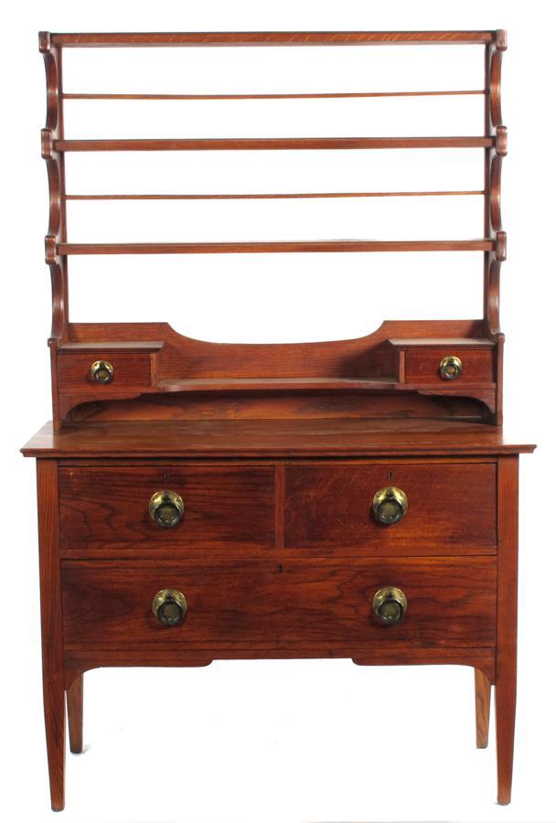 A Waring & Gillow oak dresser, with open plate rack, brass and painted metal handles, applied metal label 166cm. high, 116cm. wide