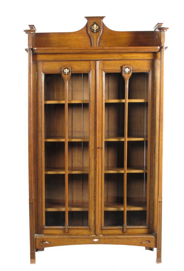An oak glazed book shelf, the glazed door flanked by reeded columns, with inlaid marquetry and steel flower stem decoration unsigned 182cm high, 97cm. wide