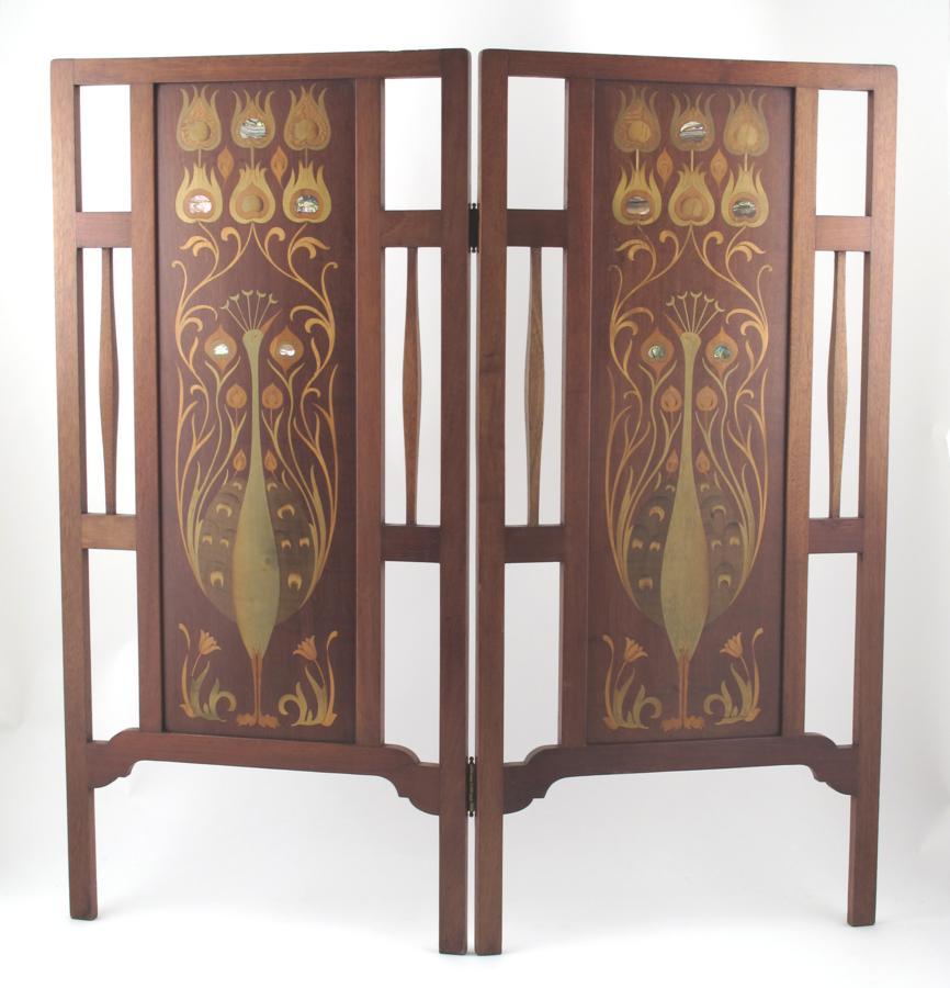 A Shapland & Petter marquetry mahogany two fold screen, decorated with stylised peacock panels inset with abalone shell eyes unsigned 94cm. high