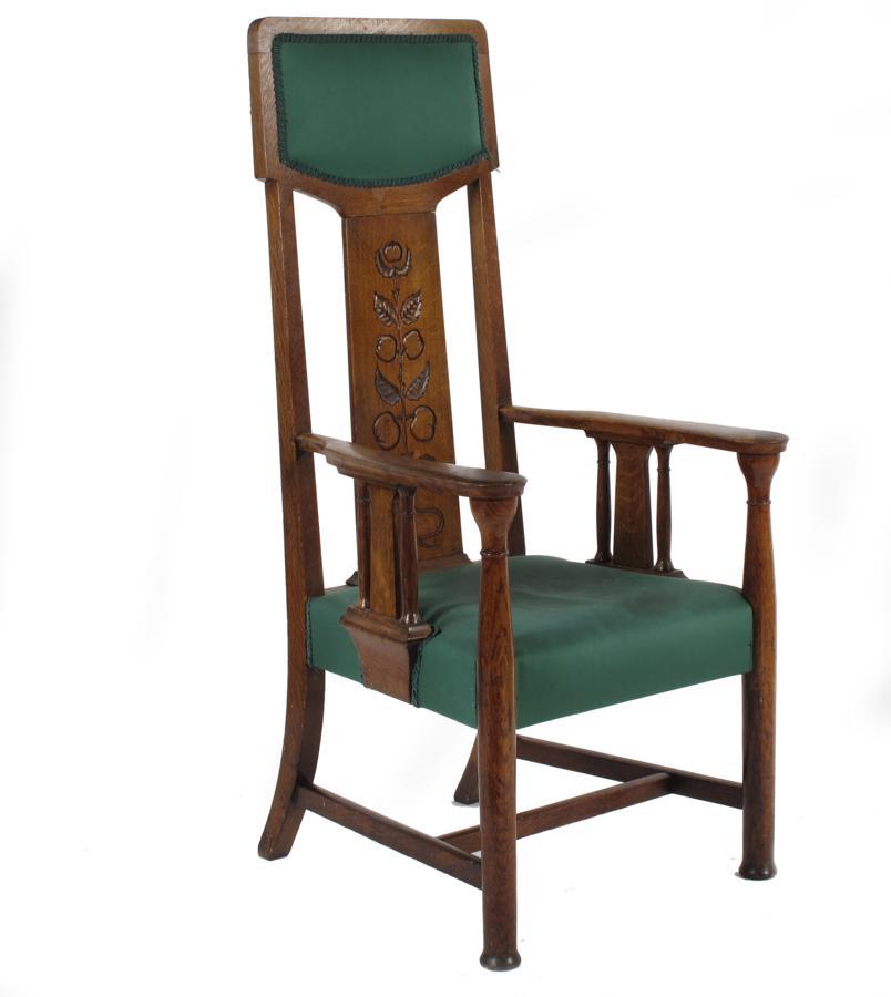 A carved oak arm chair, the design attributed to Walter Cave, carved fruiting bough to the back splat, with padded seat unsigned 137cm. high