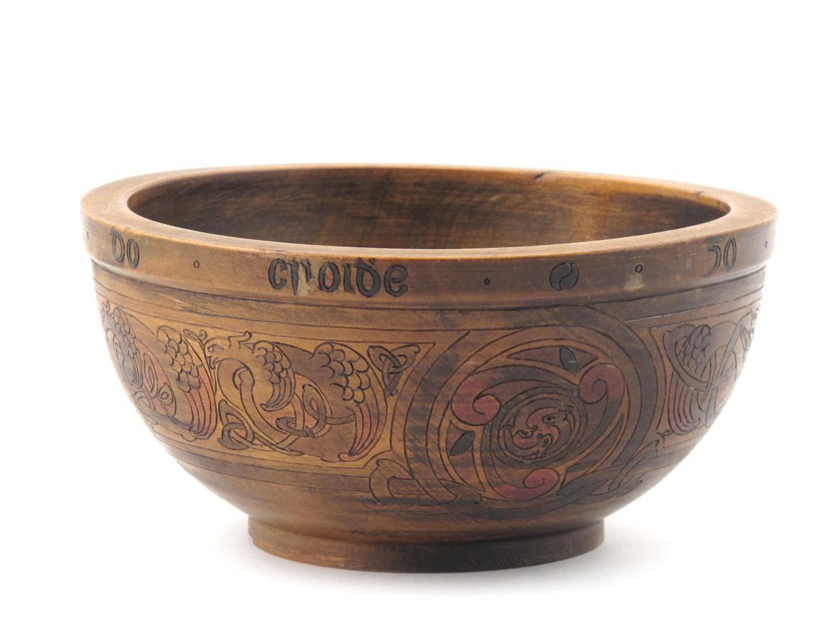 An incised and stained wooden bowl, decorated with Nordic grotesque and foliate designs, below inscription to top rim unsigned 22.5cm. diam.