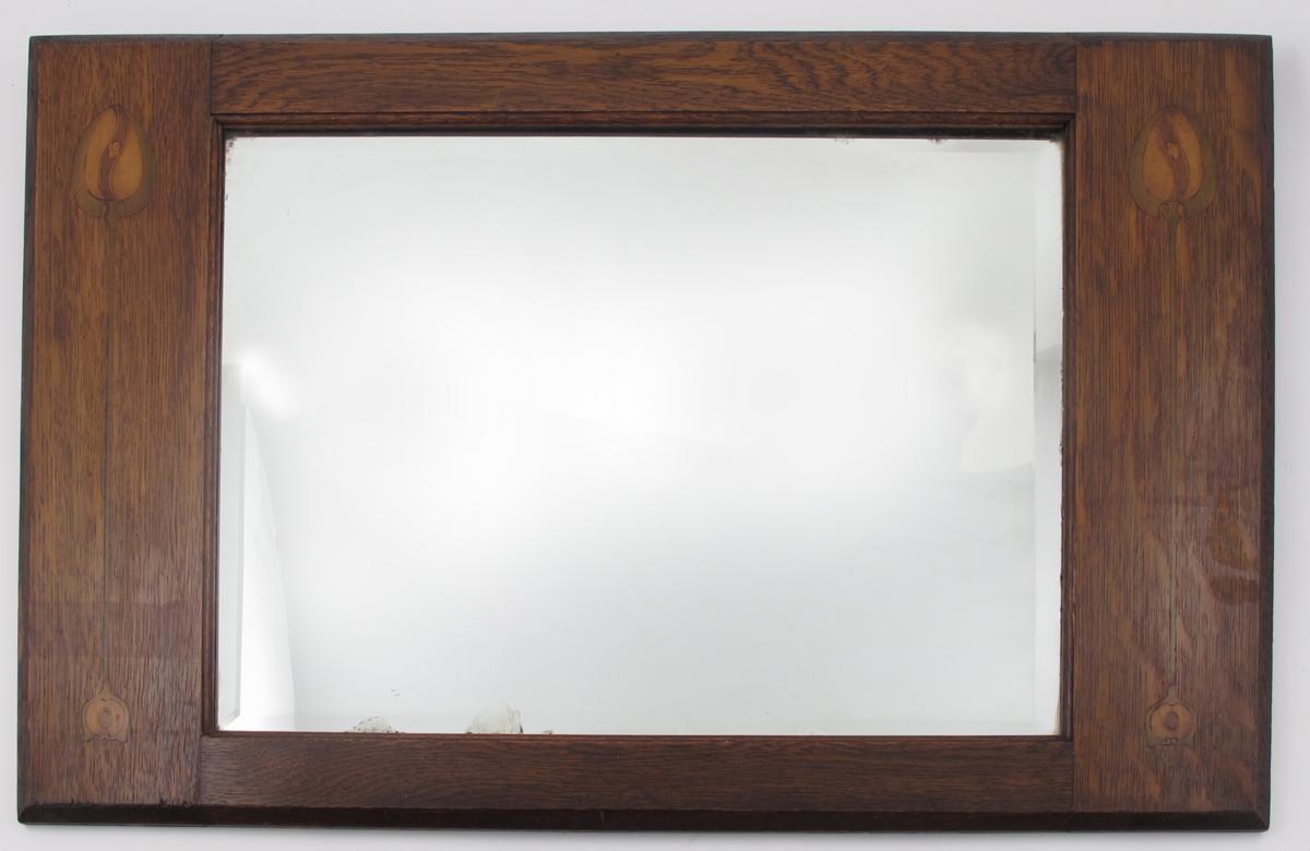 A marquetry inlaid oak wall mirror, possibly retailed by Liberty & Co, rectangular inlaid with single tulip flower stems, unsigned 83 x 52cm. high