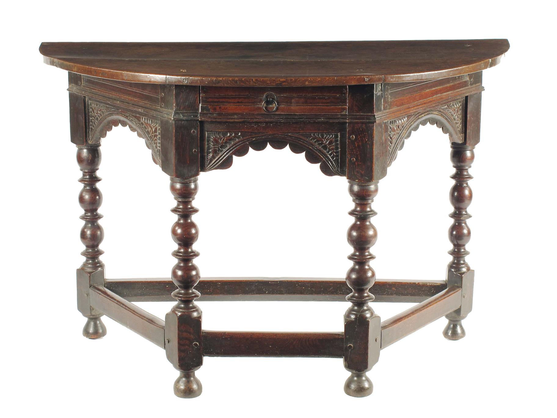 A Charles II oak credence table, the replaced demi-lune top above a later central frieze drawer and scalloped edge arches, on turned ball and fillet legs united by peripheral stretchers, 30.75in (78cm) h, 47.5in (120.5cm) w, 23in (58.5cm) d. Previously with a fold over top with a gate support, old restorations and replacements.