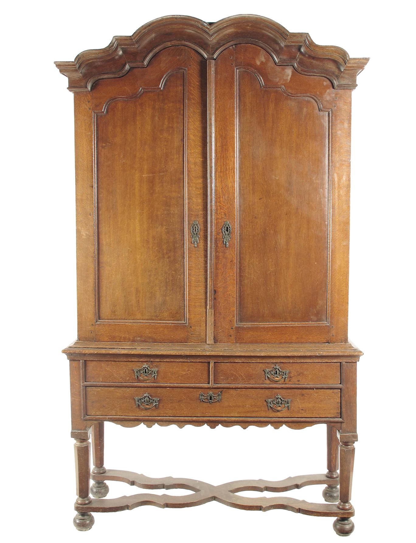 An 18th century Dutch oak cabinet on stand, the moulded shaped cornice above a pair of conforming panel doors revealing drawers and shelves, the stand with two short and one long drawer on tapering faceted legs united by a shaped 'X' stretcher and bun feet, 81.25in (206.5cm) h, 47in (119.5cm) w, 16.75in (42.5cm) d.