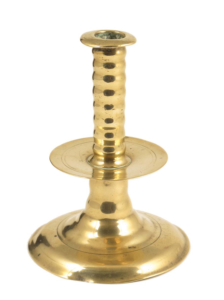 A Charles II brass 'trumpet' candlestick, the ribbed stem to a central drip tray and to a domed foot, the underside engraved with initials 'T' over 'A M', 6in (15.2cm) h, 4.5in (11.1cm) dia. Some dents and a repair to the stem.