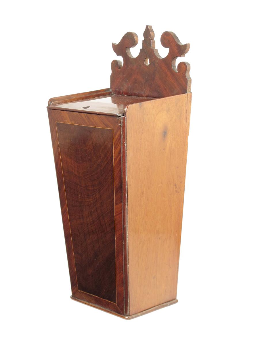 A George III mahogany candle box, inlaid stringing, the fret carved surmount to a slide-off cover, 18in (45.6cm) h, 7.25in (18.3cm) w. Some repairs.