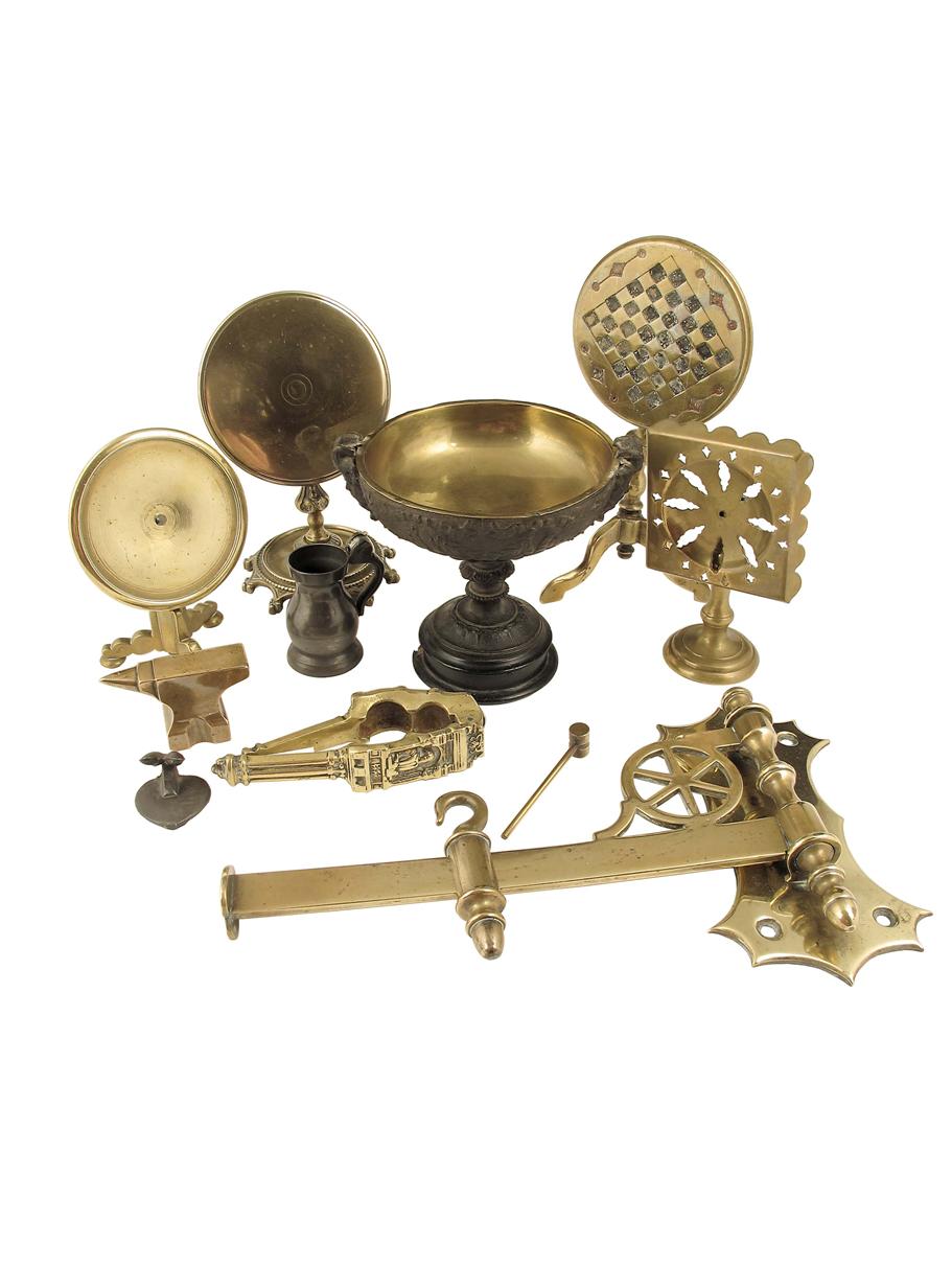 Four Victorian brass miniature tilt-top tables/reflectors, a pair of nutcrackers in Renaissance style, dated '1564'; a brass bracket with an adjustable hook, a miniature anvil and hammer, a classical cast iron tazza with a brass liner and a small pewter measure, 10.5in (26.7cm) max. (10)