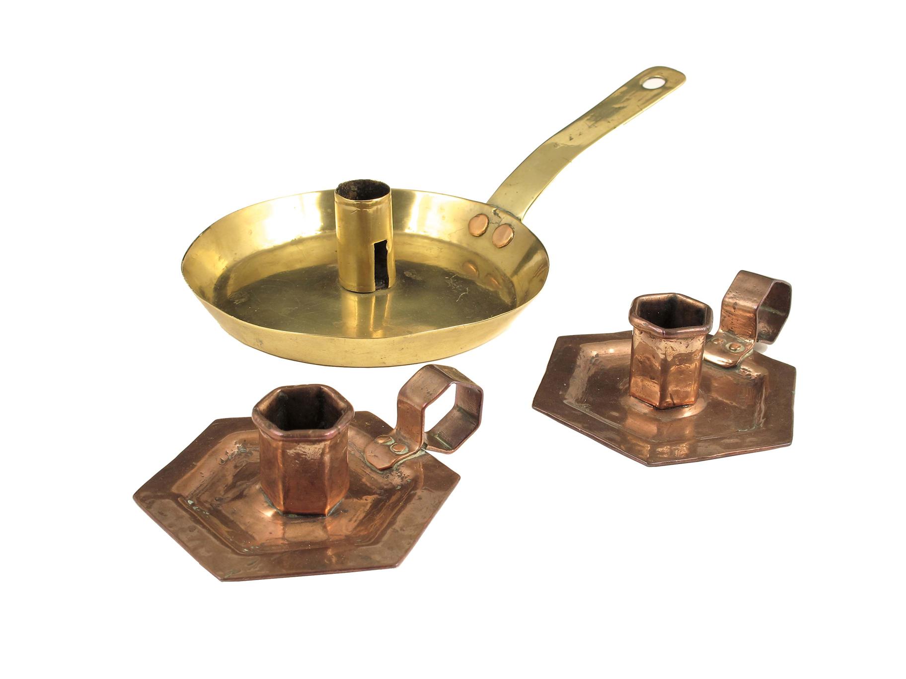 A pair of Arts & Crafts copper hexagonal chamber sticks, 4.75in (12.1cm) w, and a brass chamber stick with a circular pan and pierced handle, 10in (25.6cm) w. (3)