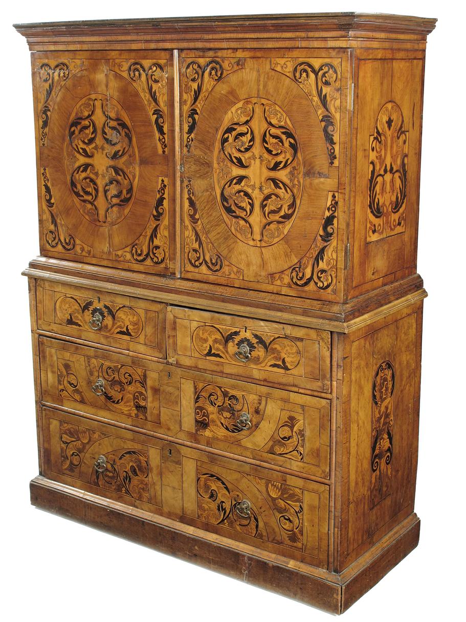 A Dutch walnut and marquetry cabinet on chest, the moulded cornice above a pair of doors with oval panels enclosing an arrangement of eight drawers around a central cupboard door enclosing a shelf, the base with two short and two long drawers with similar marquetry, on a plinth base, constructed using early 18th century elements, 59.75in (152cm) h, 45.5in (11.5cm) w, 18.5in (47cm) d.