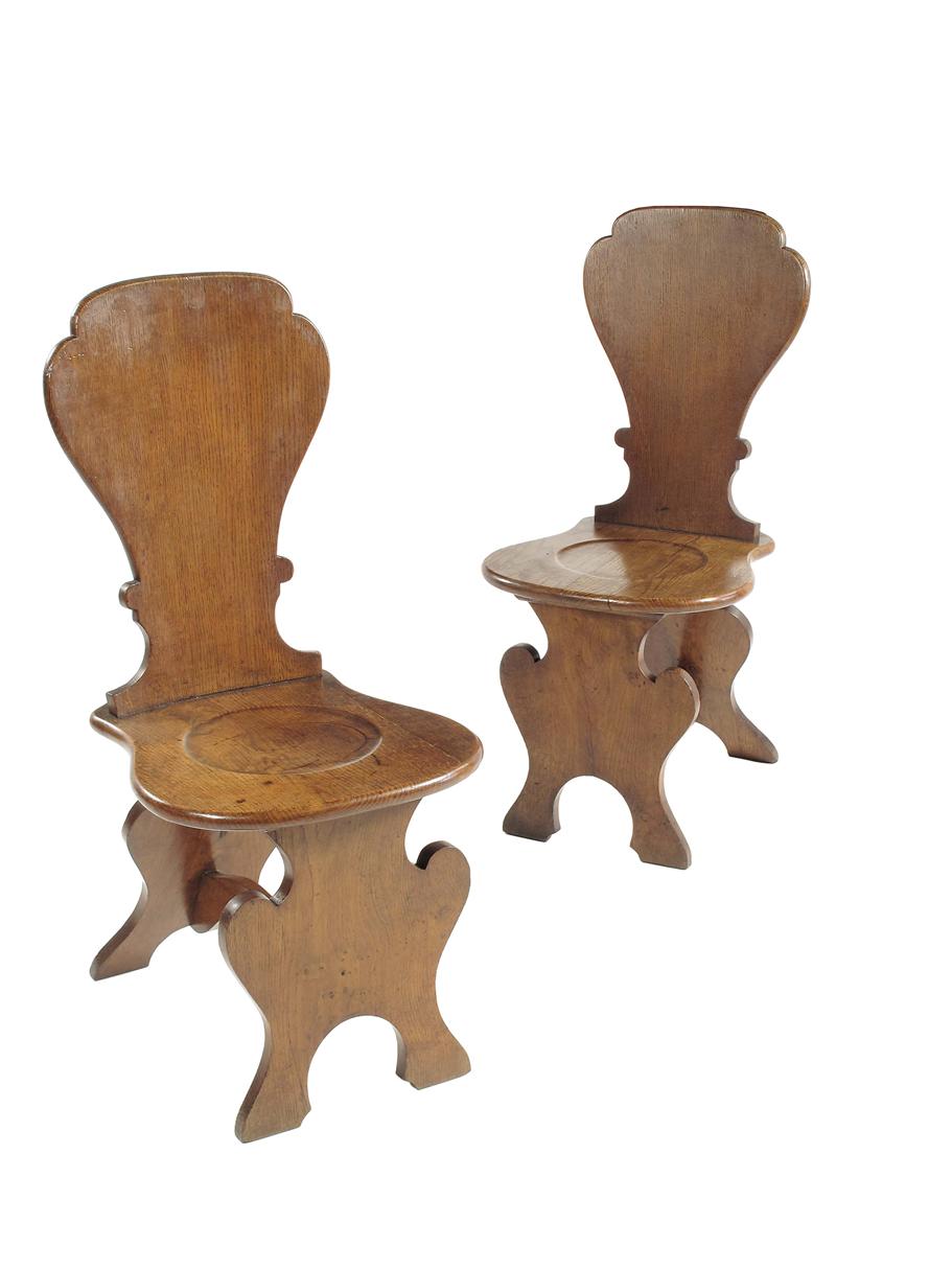 A pair of Victorian oak hall chairs, of 18th century sgabello design. (2)