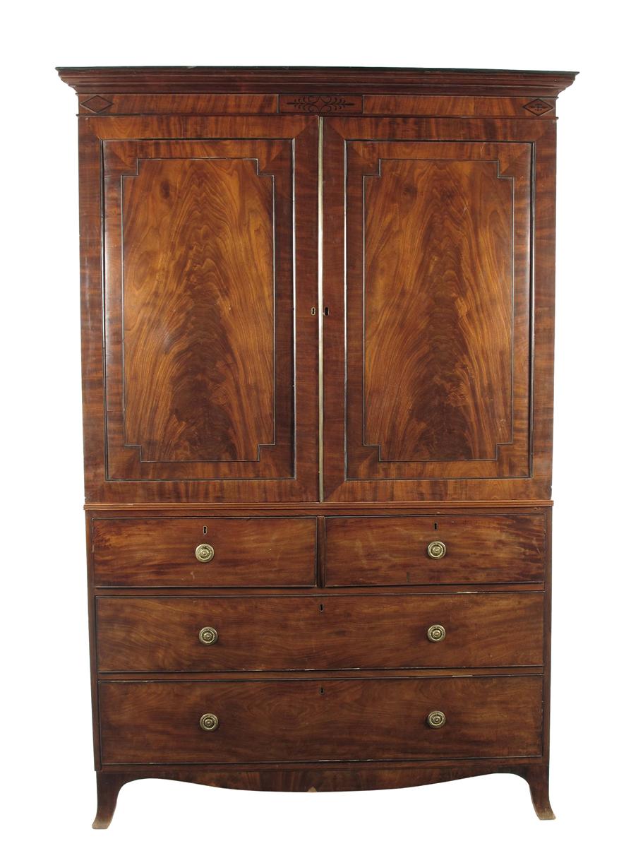 A Regency mahogany linen press, with ebonised mouldings, the detachable cornice decorated with palmettes above a pair of panelled doors enclosing five slides, the base fitted two short and two long drawers on swept bracket feet, 84in (213.4cm) h, 56in (142.5cm) w, 22.25in (56.6cm) d.