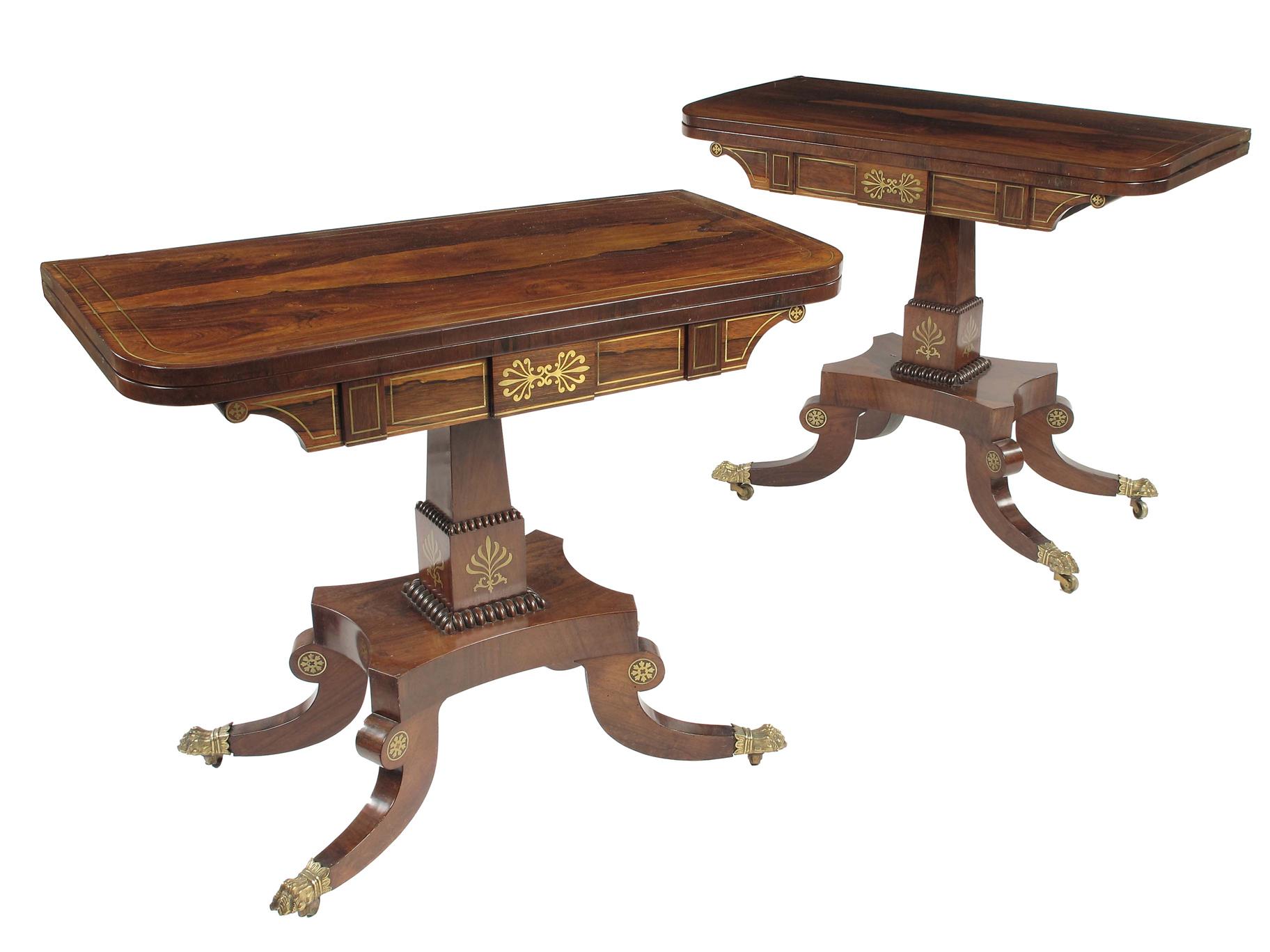 A pair of Regency rosewood and brass marquetry card tables, each with a swivel and fold over top inlaid stringing to a baize lined playing surface, above a panelled frieze centred a stylized palmette, the stepped square section stem with nulled mouldings and inlaid anthemion motifs, the platform base to hipped paterae headed downswept supports, on cast brass collared paw sabots and castors, 29in (73.7cm) h, 36in (91.4cm) w, 18.25in (46.3cm) d. (2)