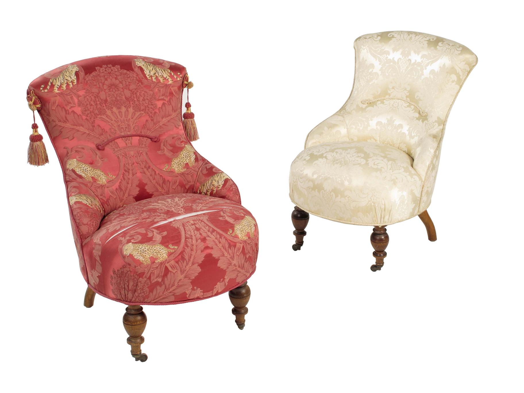 A pair of continental nursing chairs, with differing later upholstery, on turned beechwood supports and castors, late 19th / early 20th century. (2)